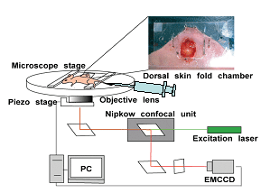 近年分子1個を識別、追跡することで薬物動態を明らかにする手法が注目されている。従来、蛍光粒子を用いた1分子計測は蛍光色素の蛍光強度不測や装置の感度不測のため計測が困難であった、一粒子計測を実現する方法として、量子ドットを用いた蛍光計測が挙げられる。我々は量子ドットを分子マーカーとし、独自に開発した超高感度蛍光計測システム(図1)を用いて生体内の薬物動態の計測を試みた。この研究において、乳癌細胞に発現したHER2タンパクに対する単クローン抗体と量子ドットの結合物を作製し、生体投与後の体内動態の計測を試みた。その結果、担癌マウスの血管内から腫瘍間質、がん細胞、さらに細胞内の一分子の動きを世界で初めて検出することに成功した(図2)。